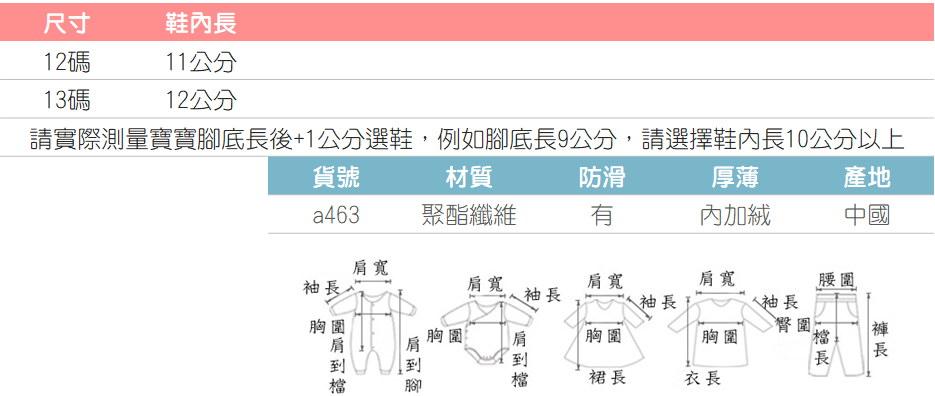 請實際測量寶寶腳底長後+1公分選擇對應尺碼